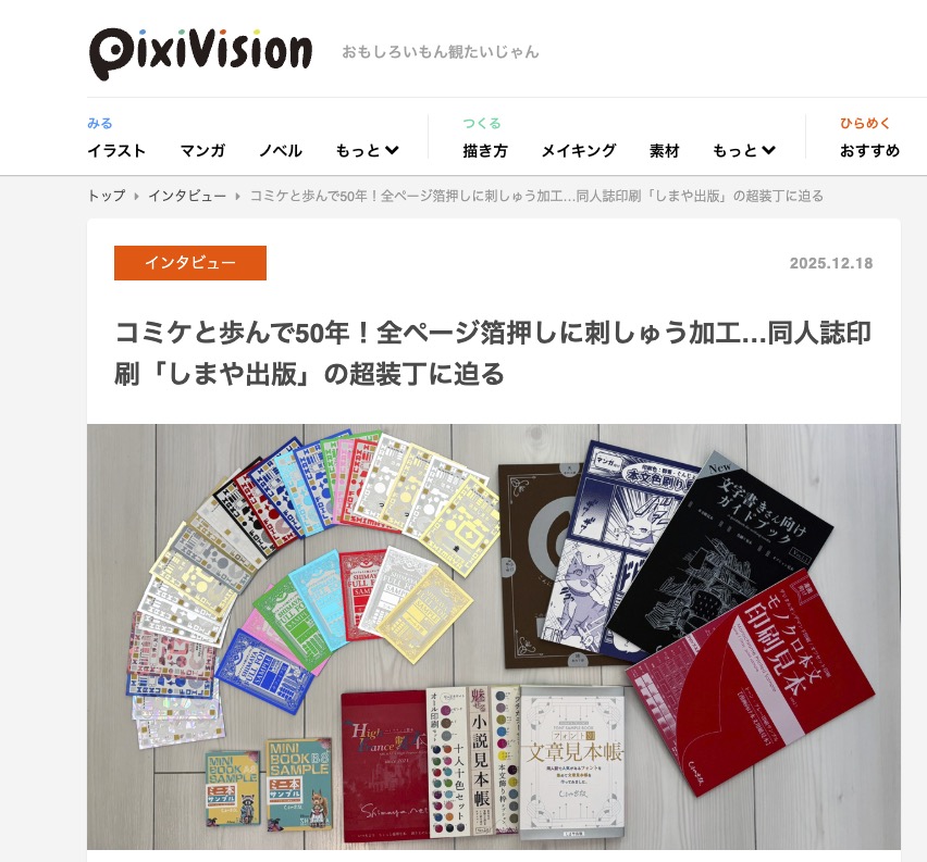 | 2025年12月18日 | 創作系メディア『pixivision』 に取り上げていただきました。 コミケと歩んで50年!全ページ箔押しに刺しゅう加工…同人誌印刷「しまや出版」の超装丁に迫る