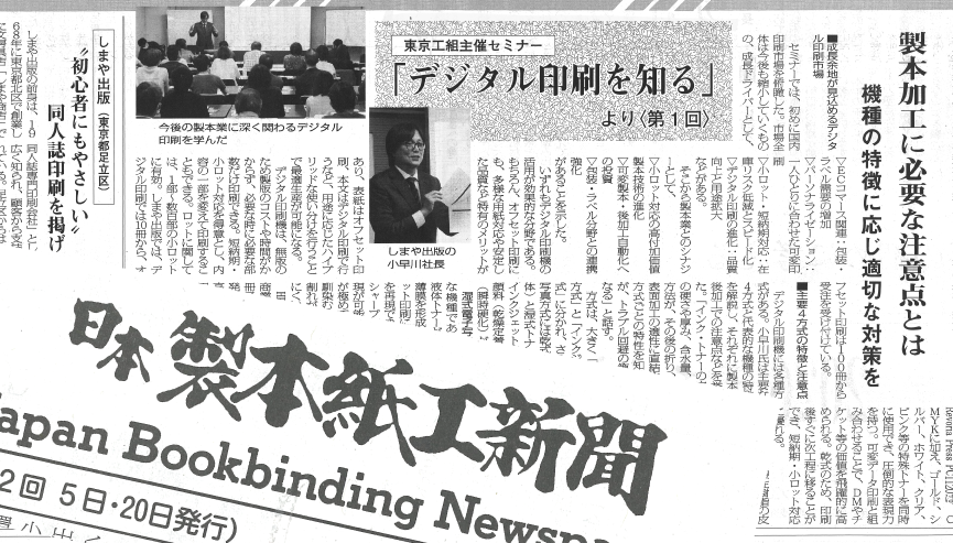 | 2026年1月5日 | 業界誌『日本製本紙工新聞』に、セミナーの様子が取り上げられました。 東京工組主催セミナー「デジタル印刷を知る」にて、弊社代表小早川が講師を務めました。