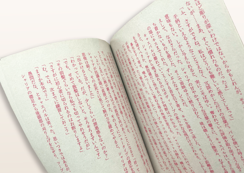 グレーがかった本文紙に紅い文字がなじみ、落ち着いた色合いで物語を引き立てています。