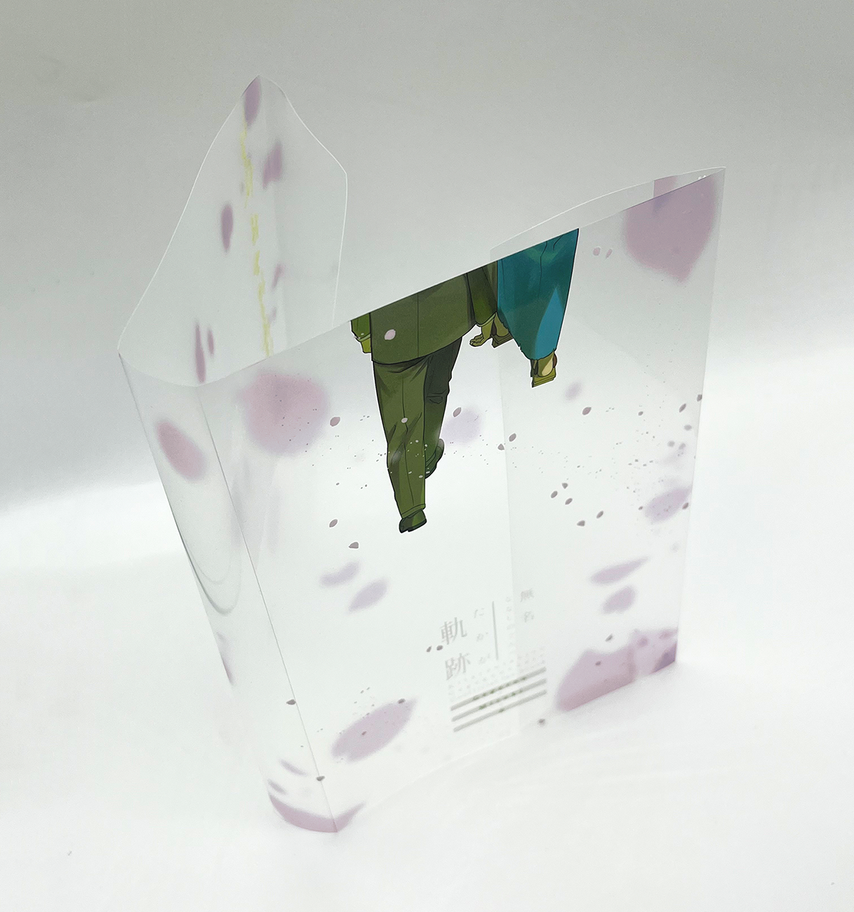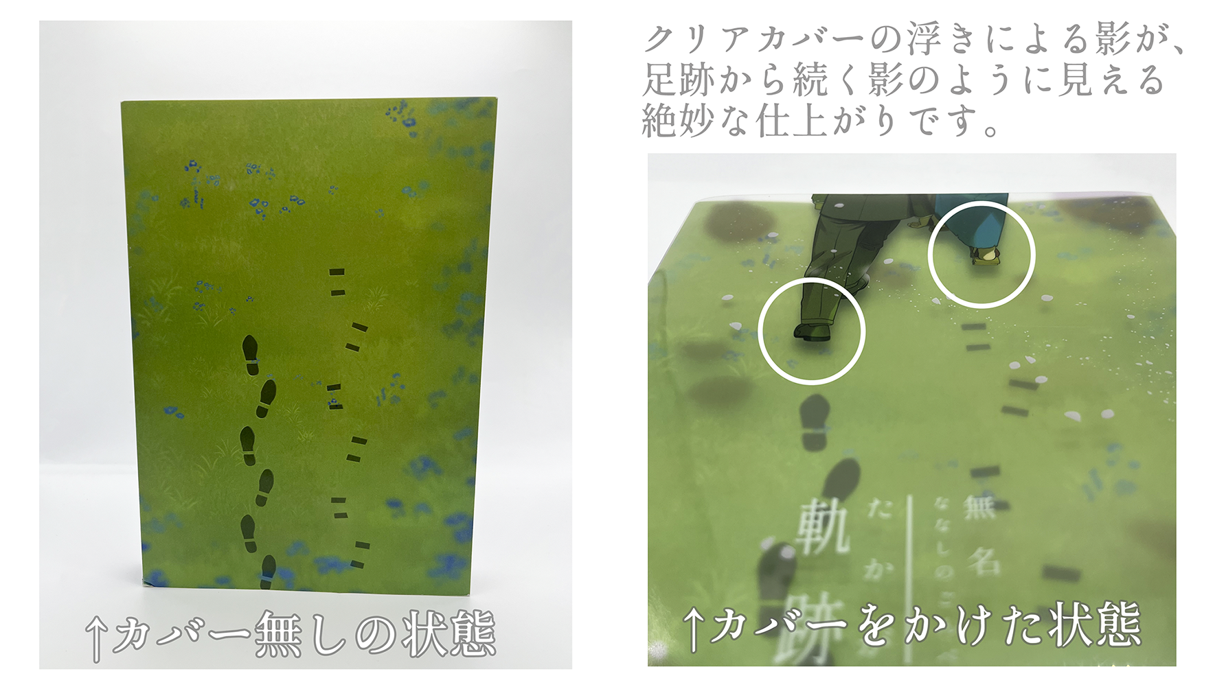 クリアカバーに描かれたイラストは、カバーの浮きにより表紙に影を落としています。