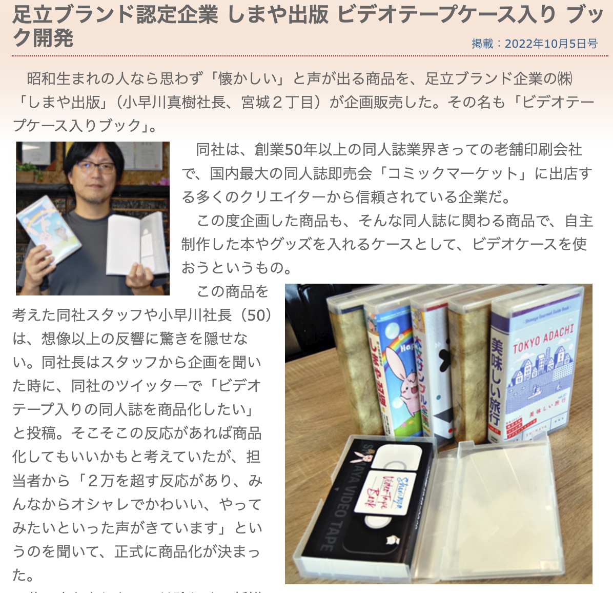 2022年10月5日 | 【足立朝日】に、"ビデオテープケース入り ブック"を取り上げていただきました! 足立ブランド認定企業 しまや出版 ビデオテープケース入り ブック開発 ![]() |