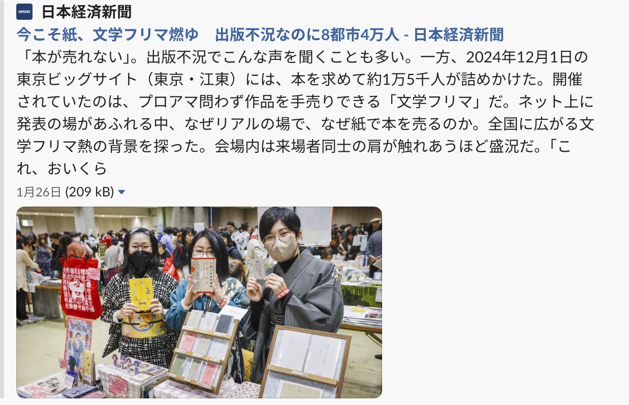 2025年1月26日 | 日本経済新聞【日経MJ】に取り上げていただきました。 今こそ紙、文学フリマ燃ゆ 出版不況なのに8都市4万人 ![]() |