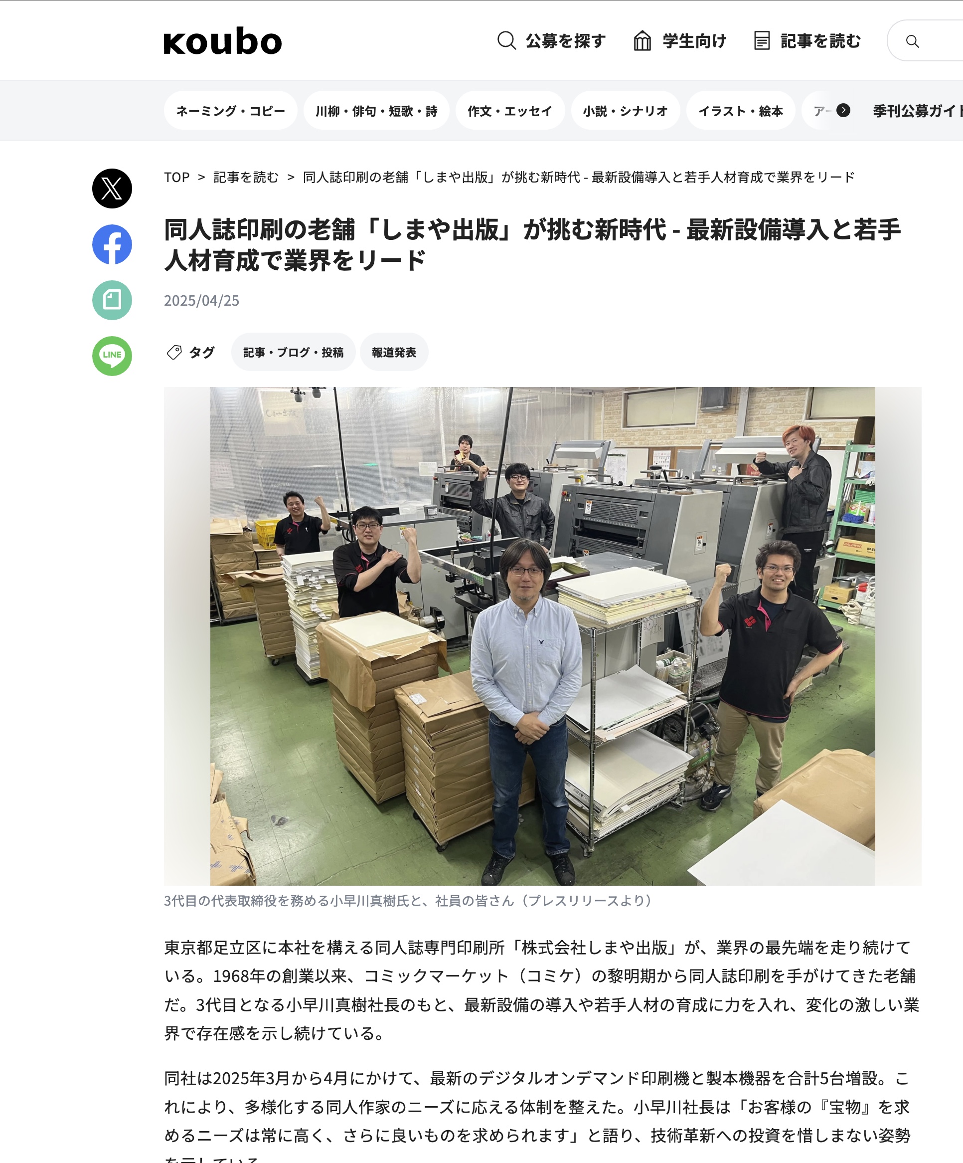 2025年4月25日 | コンテスト情報サイト「Koubo」に取り上げていただきました。 同人誌印刷の老舗「しまや出版」が挑む新時代 - 最新設備導入と若手人材育成で業界をリード ![]() |