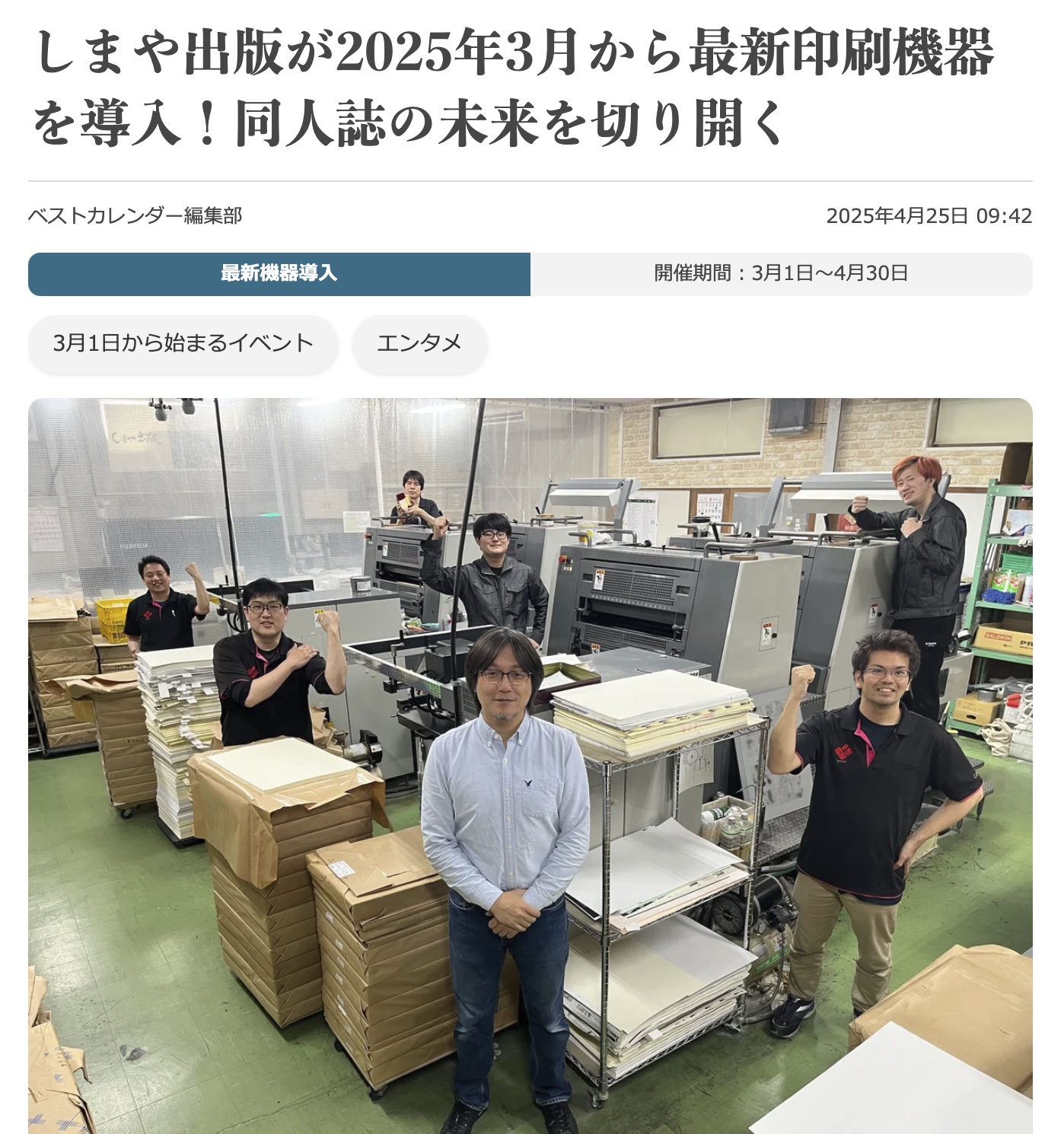 2025年4月25日 | 「ベストカレンダー」に取り上げていただきました。 しまや出版が2025年3月から最新印刷機器を導入!同人誌の未来を切り開く ![]() |