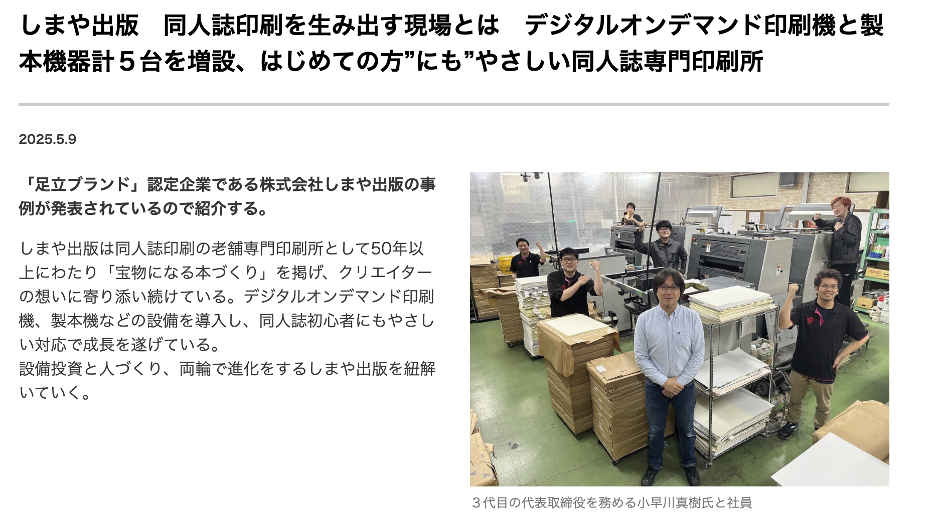 2025年5月9日 | 印刷業界ニュース「ニュープリネット」に取り上げていただきました。 しまや出版 同人誌印刷を生み出す現場とは ![]() |