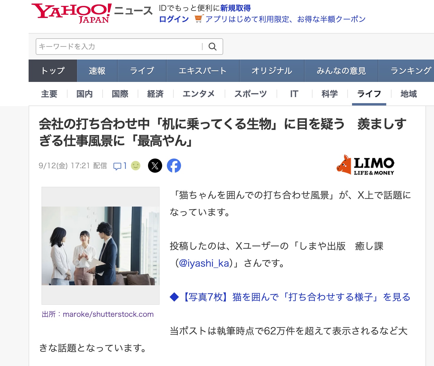 2025年9月12日癒し課 | Yahoo!ニュースに「LIMO [リーモ]」さんの記事を取り上げていただきました! 会社の打ち合わせ中「机に乗ってくる生物」に目を疑う 羨ましすぎる仕事風景に「最高やん」 ![]() |